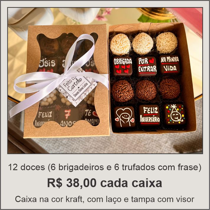 R$ 38,00 – 12 doces (6 brigadeiros e 6 trufados com frase)