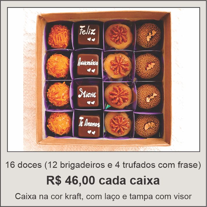 R$ 46,00 – 16 doces (12 brigadeiros e 4 trufados com frase)