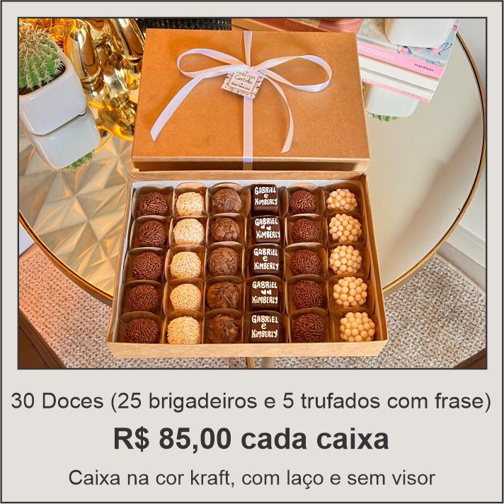 R$ 85,00 – 30 doces (25 brigadeiros e 5 trufados com frase)