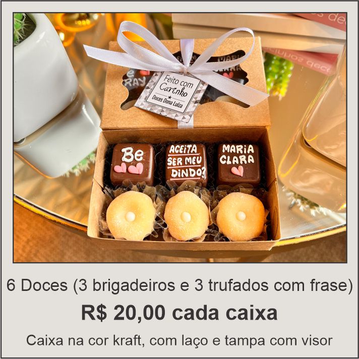 R$ 20,00 – 6 doces (3 brigadeiros e 3 trufados com frase)